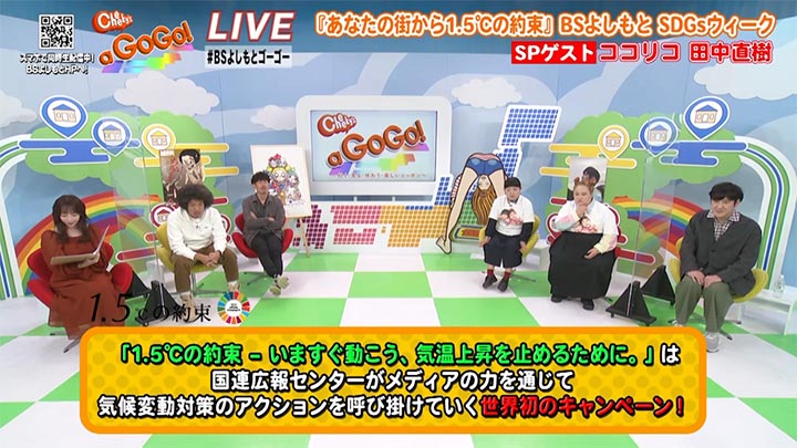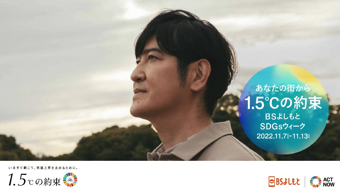 BSよしもとは、国連「SDGメディア・コンパクト」加盟メディアによる、国レベルでの世界初の共同キャンペーン「1.5℃の約束ーいますぐ動こう、気温上昇を止めるために。」に参加。2022年11月7日(月)~11月13日(日)の1週間でオリジナルキャンペーン『あなたの街から、1.5℃の約束 BSよしもと SDGsウィーク』を実施し、放送中の番組での特集やSDGsウィーク特番を放送しました。